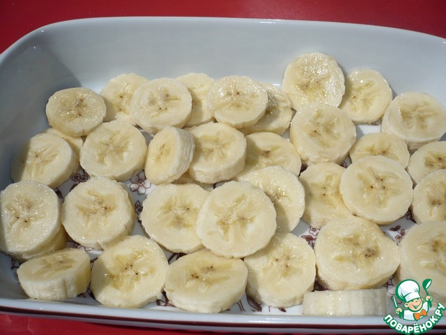 Разогреваем духовку до 190 градусов. Берем керамическую форму для запекания (размер 22х14). Форму необходимо немного смазать растительным маслом. Бананы режем кольцами и выкладываем в форму.