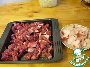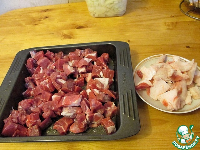 Сначала порежем мясо и бараний жир, сегодня без курдюка делал, так как жирка и так хватило. Мясо режем не крупно, на фото видно как.