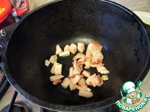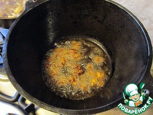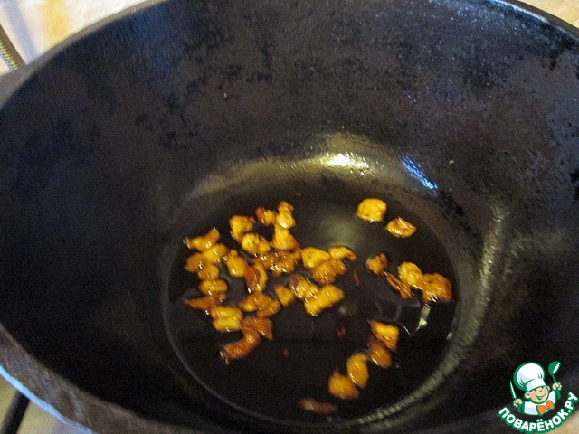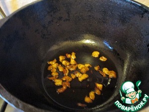 Закидываем жирок в казан и вытапливаем его. Если нет ни жира ни курдюка то используем рафинированное растительное масло.