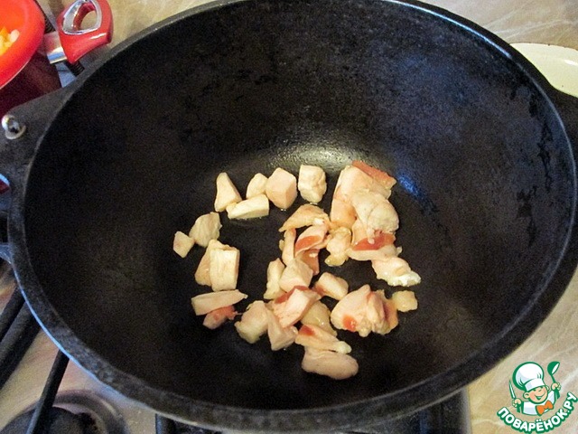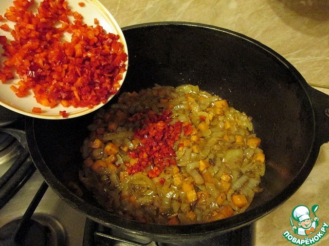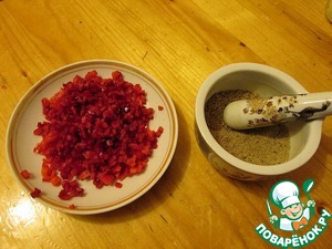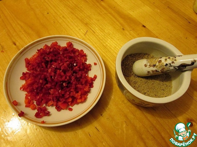 Давим все это в ступке, не сильно, что б зира «раскрылась». Режем чили перец меленьким кубиком.