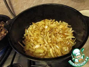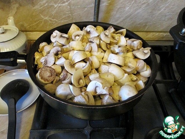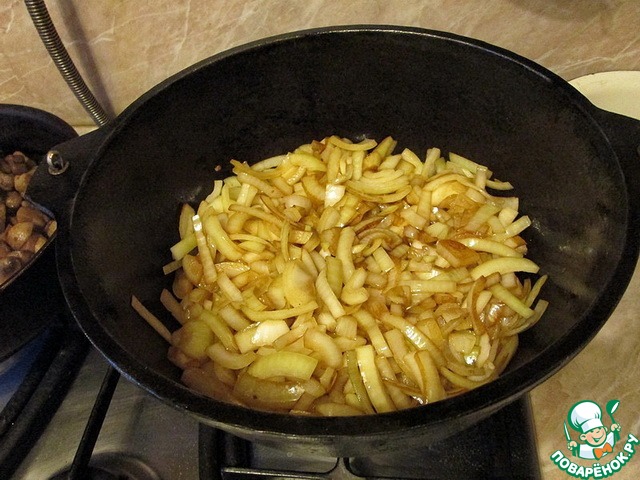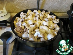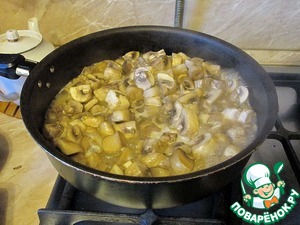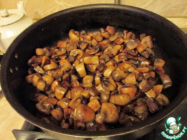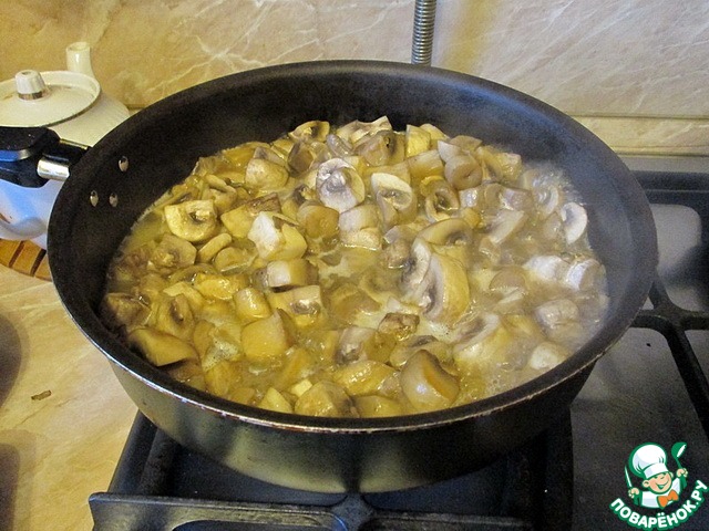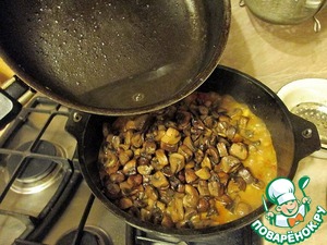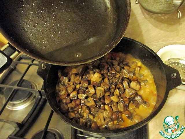 Вводим грибы. Не забывает кипятком со сковородки смыть вусняшку.