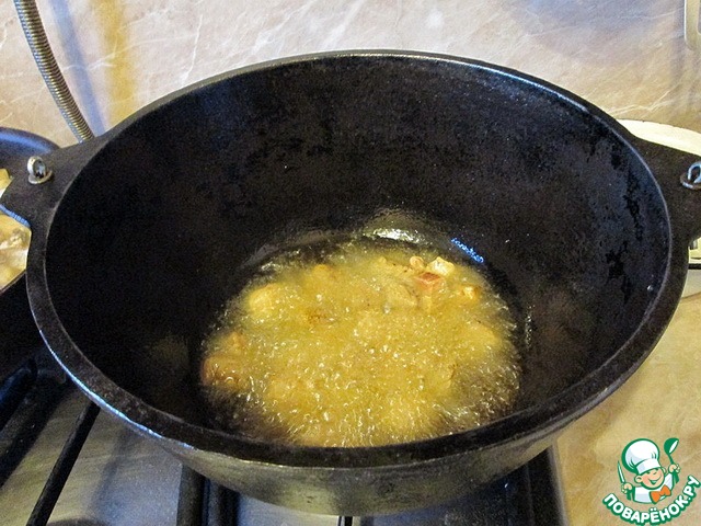 В сильно разогретый жир закидываем мясо, закидываем не большими партиями, и обжариваем.
