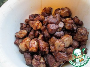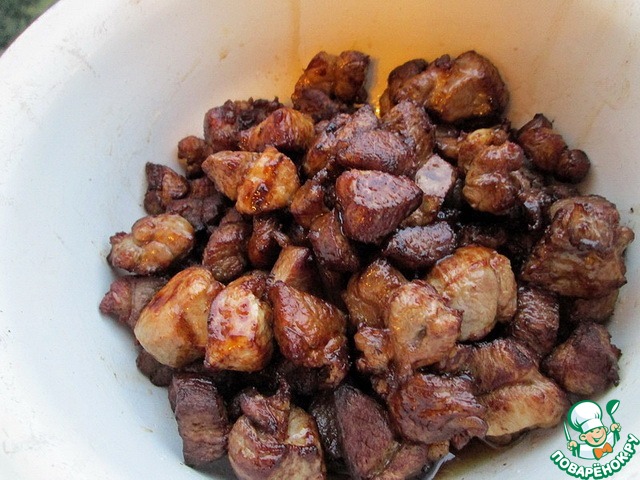 Мясо не сильно жарим, аккуратно. Куски у нас не большие, не «пересушите». Жарим вот до такого состояния. Жареное мясо в отдельную мисочку складываем.