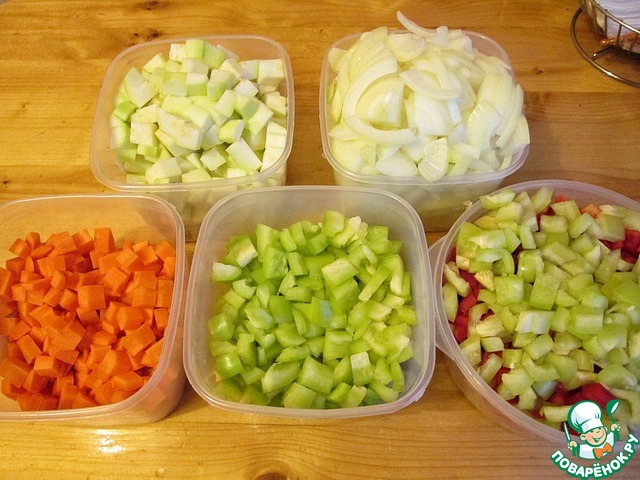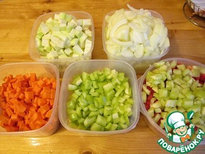 Пока жарилось мясо режем овощи, все кубиком, кроме лука, лук четверть кольцами. Ну на фото видно как.