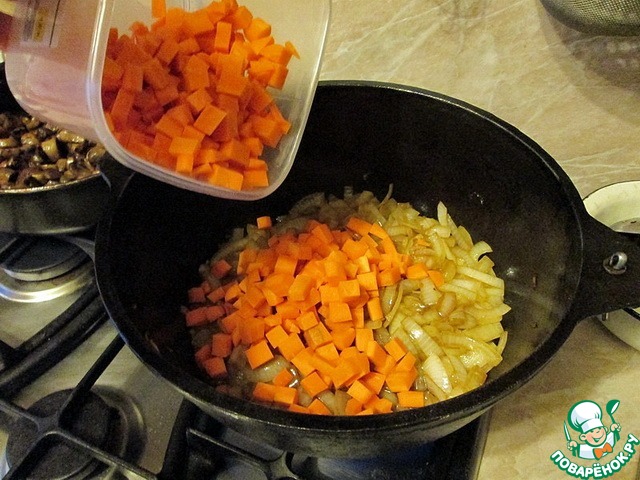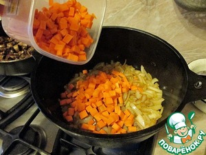 Когда лук усядет на треть вводим морковку. Не забываем мешать, что б ничего не подгорало.