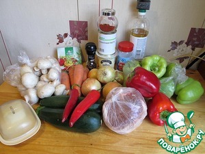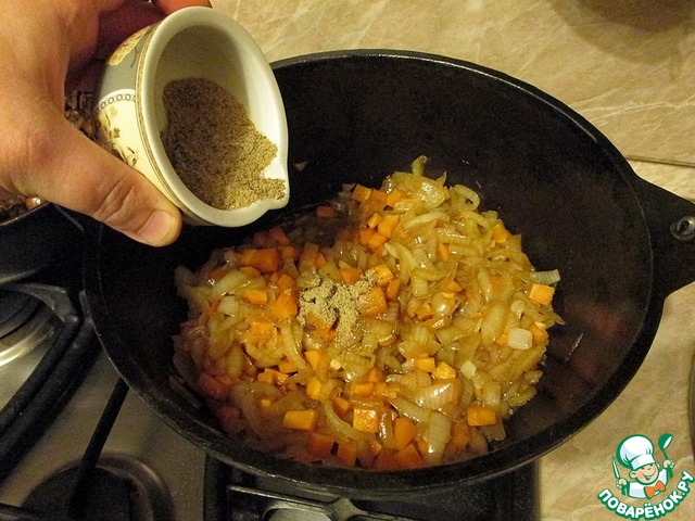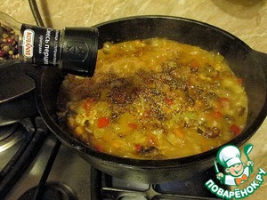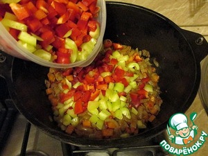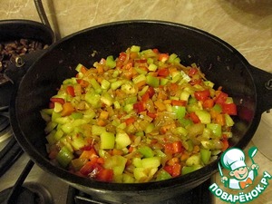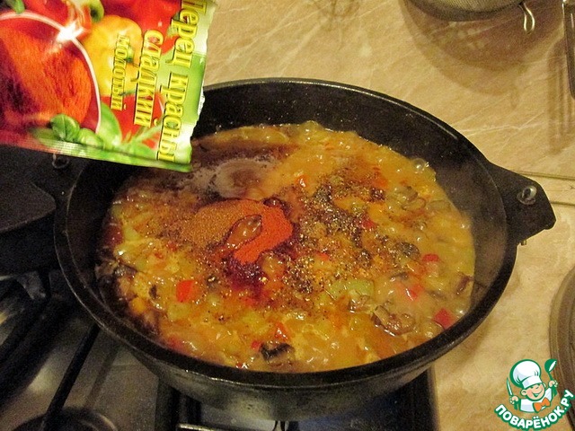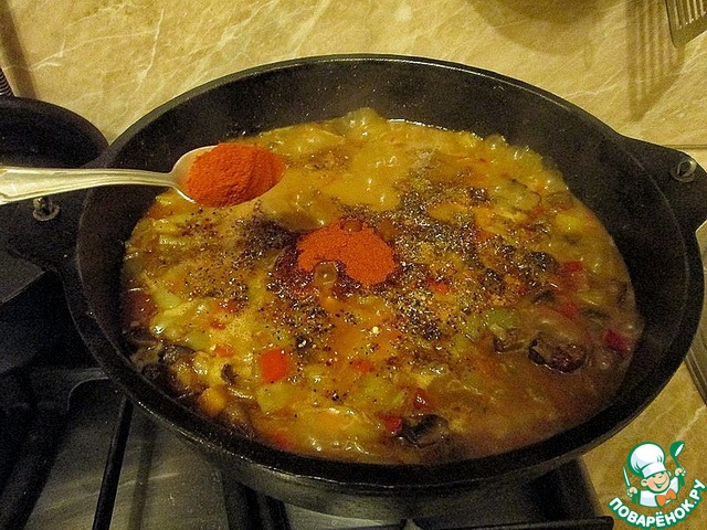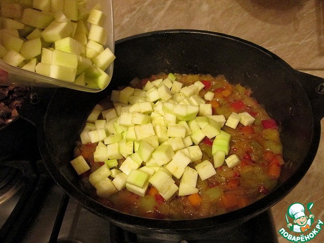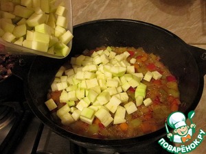 Когда перец даст сок активно, отправляем кабачок туда. Ждем когда кабачок тоже сок даст.