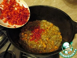 Туда же Чили и тщательно перемешиваем. Далее минут пять жарим помешивая.