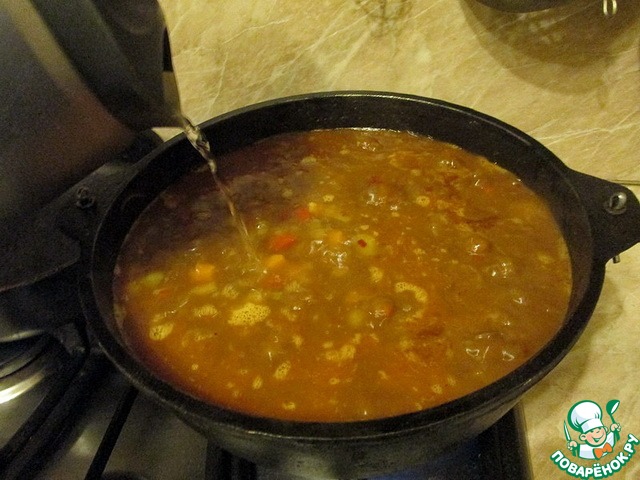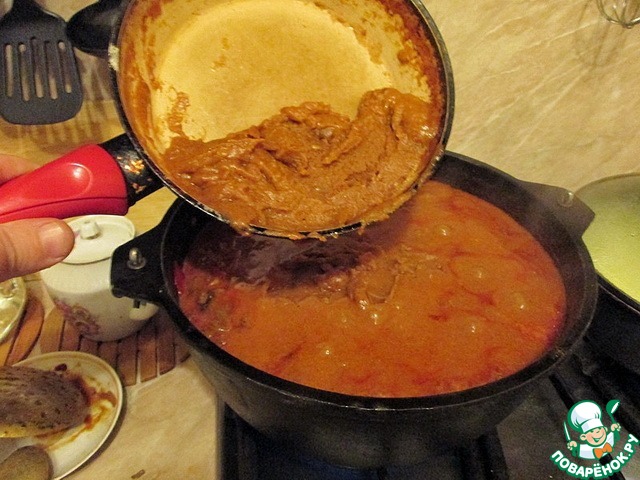Острота подливки не сильная получается, если вам не нравится остринка небольшая, то количество всех перцев уполовиньте. Количество привожу на шестилитровый казан, под свой объем сами пересчитаете. Если нет казана, то сее легко обходится кастрюлей и сковородкой.
