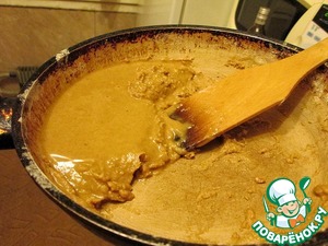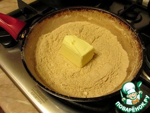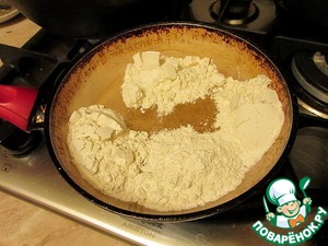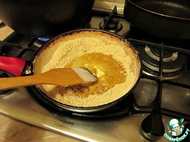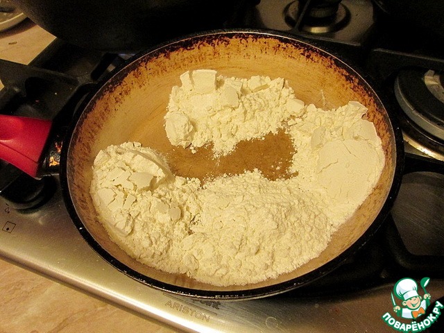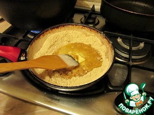 На не сильном огне обжариваем муку вот до такого цвета, добавляем сливочное масло.