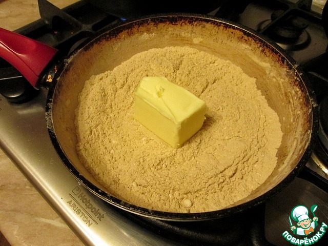 Пока тихонечко булькает мы займемся загустителем. Загустителем будет выступать золотистый ру. Для справки: