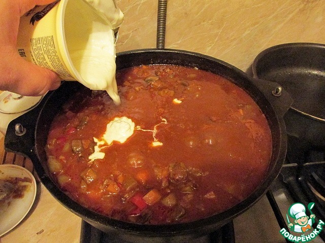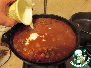 Вводим сметану, и еще 10 минут ждем. Не забываем тщательно мешать.