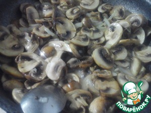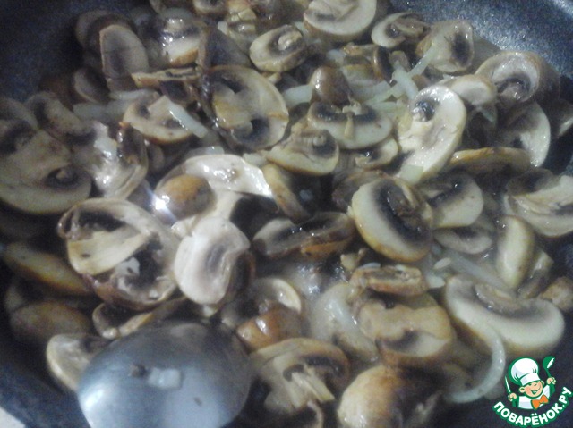Шампиньоны нарезать тонкими пластиками и добавить к луку. Жарить до готовности грибов. Остудить и выложить в дуршлаг чтобы стекло масло.