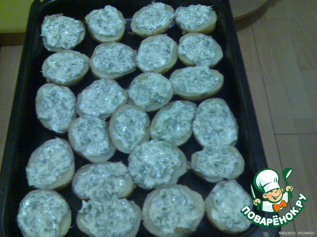 Разрезать картошку на половину, смазать приготовленным соусом и поставить минут на 20-30 в духовку до готовности. |