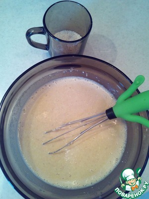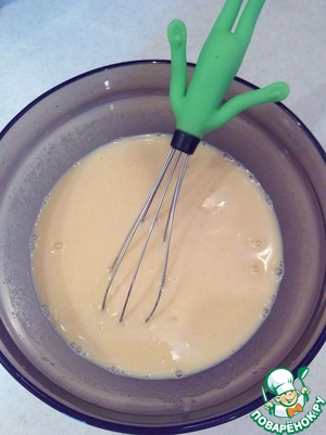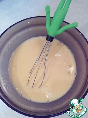 В миску разбить яйца, добавить к ним яблочное пюре, молоко, соду и соль, тщательно перемешать до получения однородной смеси.