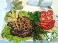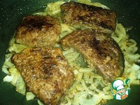 Затем добавить печень к луку. Добавить 3 ст. л. воды. Потушить с одной стороны 1 минуту, затем перевернуть печень и тушить ещё 1 минуту. Вот и всё! Наши отбивные готовы! |