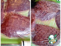 Выкладываем кусочки печени в полиэтиленовый пакет и отбиваем с двух сторон, не сильно. Можно использовать пищевую пленку, но мне удобно использовать пакет. |