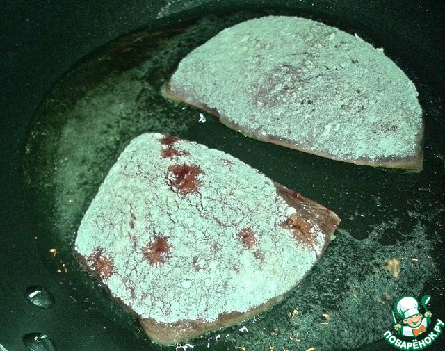 Жарим печеночные отбивные в сковороде на разогретом растительном масле до готовности. Приблизительно по 2 минуты с каждой стороны, крышкой накрывать не нужно. |