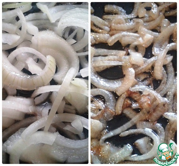 В сковороду, где жарилась печень, положить репчатый лук. Обжаривать до слегка карамельного цвета. Следить, чтобы лук не подгорел! Лук должен оставаться хрустящим. |