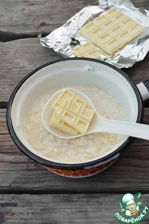 Как только каша загустеет, добавьте в нее кусочки белого шоколада, и нагревайте пока шоколад полностью не растворится