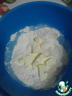 Нарезать масло кубиками и добавить к мучной смеси. Измельчить масло с мукой в крошкупри помощи ножа или вилки (пока кусочки масла не станут размером примерно с горошину).