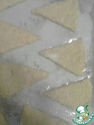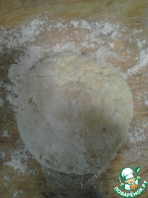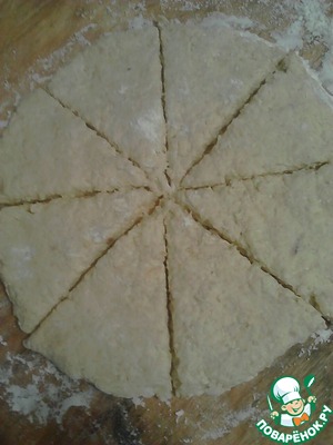 Тесто выложить на слегка припыленный мукой поверхность, раскатать в диск. Разрезать диск на 8 секторов.