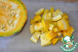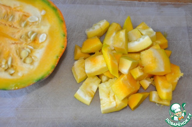Берём тыкву, чистим, режем. Доводим до готовности любым удобным способом: варим, запекаем или готовим в микроволновке.