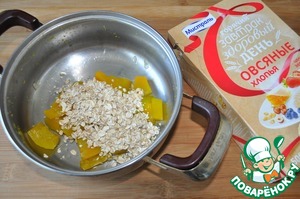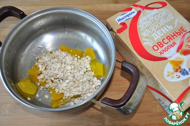 С готовой тыквы сливаем воду, если вы её варили, и горячую засыпаем овсяными хлопьями.