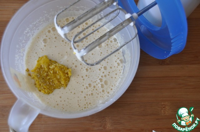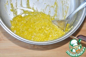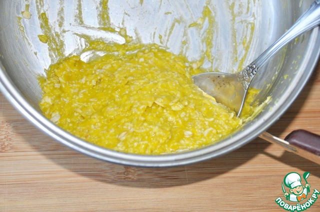 Добавляем во взбитые яйца тыквенно-овсяное пюре и растопленное сливочное масло. Перемешиваем.