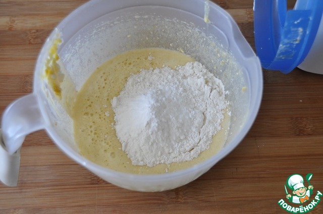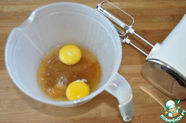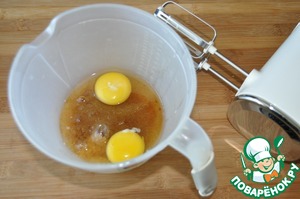 Берём сахар, у меня коричневый и взбиваем в пену с яйцами.