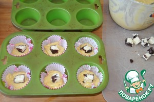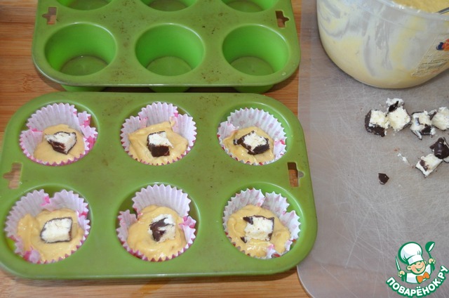 Кладём в формочки по ложке теста и сверху кусочек творожного сырка или 1/2 чайной ложки сладкой творожной массы. У меня сырки кокосовые глазированные шоколадом. -