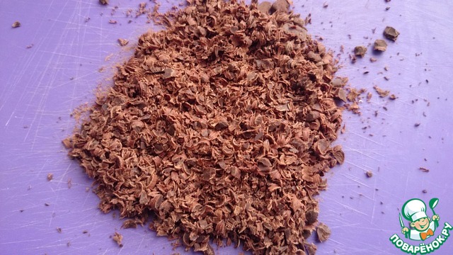 Шоколад можно потереть на мелкой терке, а можно нарезать небольшими кусочками. Первый вариант показался мне более эстетичным. В дополнение этого шага скажу, что шоколада можно взять и больше и меньше, у меня была гигантская плитка очень темного шоколада, поэтому одной полоски, состоящей из 4-х квадратиков, мне было более чем достаточно.