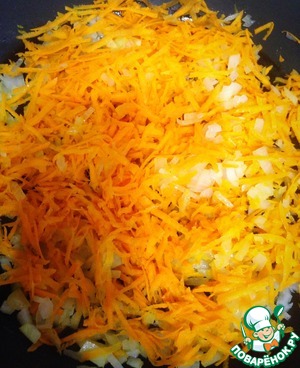 К луку добавляем морковь, натертую на терке. Можно нарезать брусочками.