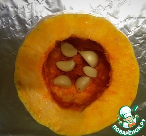 Включаем духовку на 200 градусов. В тыкву кладем чеснок, можно немного присолить.