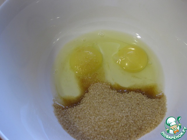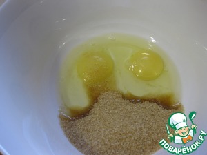 В одной миске смешиваем сахар и яйца (можно сразу смешать все жидкие ингредиенты, но я кефиром и маслом в конце регулировала густоту теста)