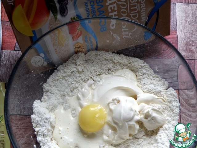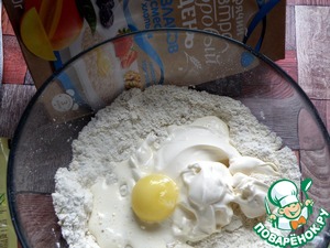 На сухую смесь сверху выложить сметану, добавить желток, ложку масла и ложку сливок. Быстро замесить нежное тесто.