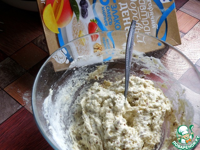 Просеять в миску муку с разрыхлителем и добавить сухое молоко. Перемешать и всыпать хлопья «Пять злаков» от «Мистраль», добавить по ложке кунжута и семян льна. Немного посолить и добавить ложечку сахара. Снова перемешать.