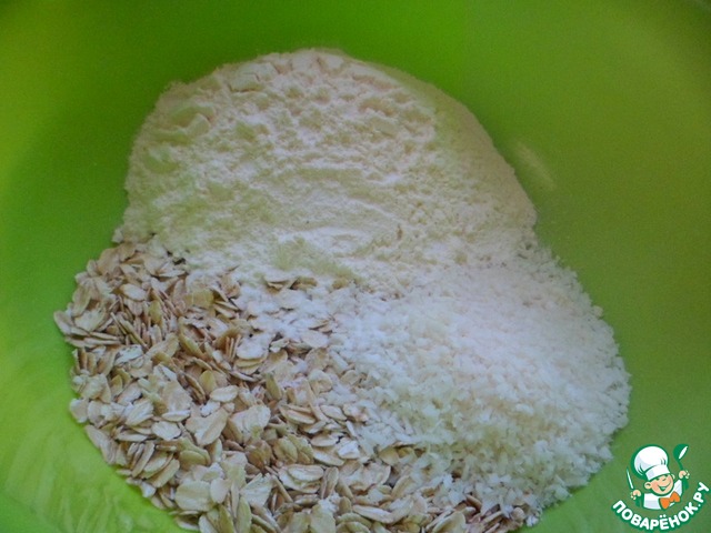 Овсяные хлопья цельнозерновые ТМ Мистраль тщательно смешать с мукой, содой, кокосовой стружкой и солью