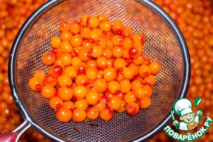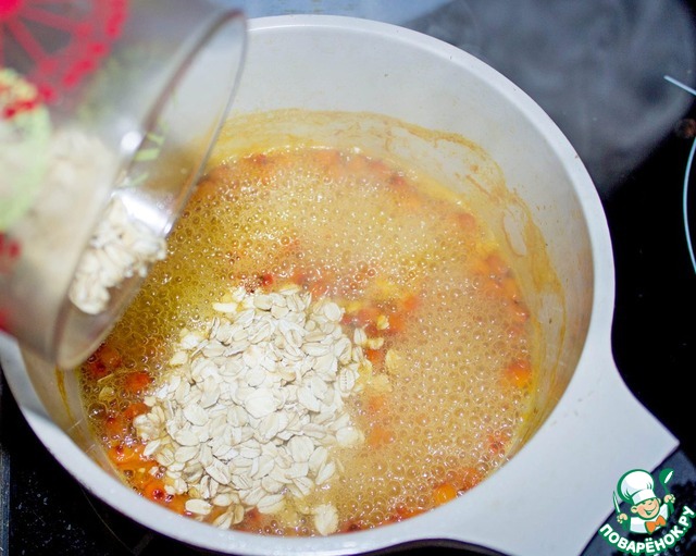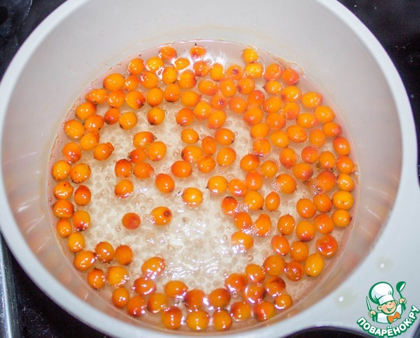 В закипевшую воду добавляем сахар и облепиху, варим на сильном огне 10 минут.