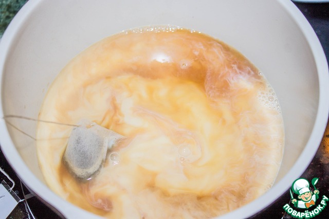 В кипящую воду опускаем пакетик чая и кипятим 1 минуту. Чай лучше брать ягодный или фруктовый.