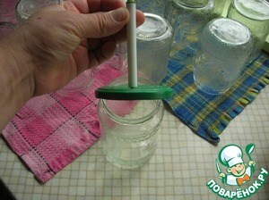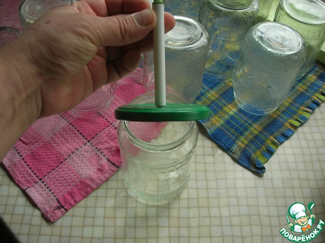А для того чтобы из горячей воды было удобно доставать горячие крышки я использую специальную "приспособу" купленную в комплекте для консервирования. Это пластиковая трубочка с магнитиком на конце. Примагничивает крышку из горячей кастрюльки и на баночку. Поверьте это очень и очень удобно!!!