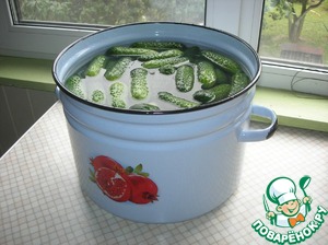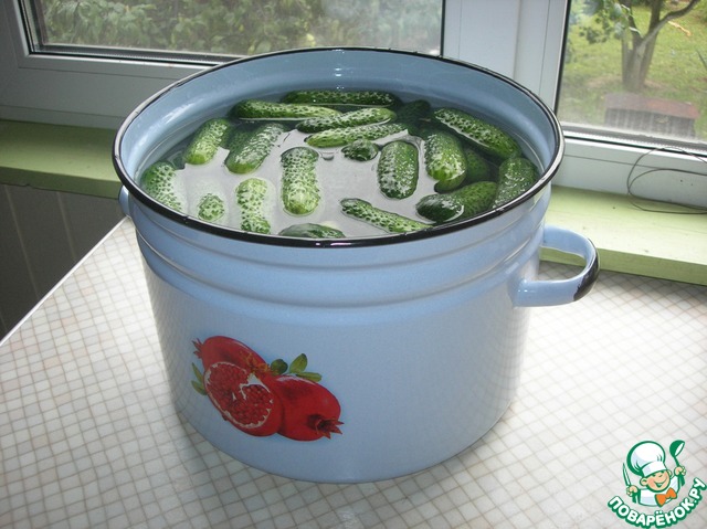 Берем огурцы хорошо моем и замачиваем в холодной воде на несколько часов, чтобы огурчики набрали твердость и вода заполнила внутренние пустоты. Если этот шаг пропустить, то как только мы зальем огурчики горячим маринадом и закатаем банку, то под крышкой через некоторое время образуется пустота, потому как вакуум вытеснит воздух из огурца и заполнит его маринадом из банки.