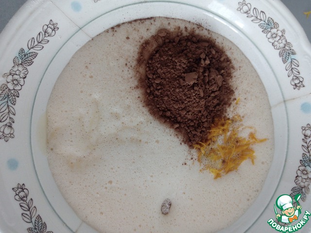 • Затем добавляем яйца, цедру, какао, соду и растопленное масло к измельченным хлопьям. Тщательно перемешиваем.