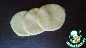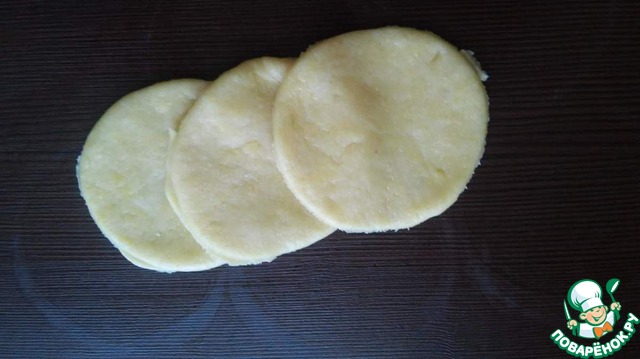 По истечении времени начинаем формировать пирог. Отщипнуть от общего куска теста небольшой шарик и раскатать не слишком тонко. Берем стакан или если вы не хотите слишком крупные розочки, можно взять посуду меньшего диаметра и вырезать круги по всей длине и ширине раскатанного листа. Получившиеся обрезки между кружками убираем.