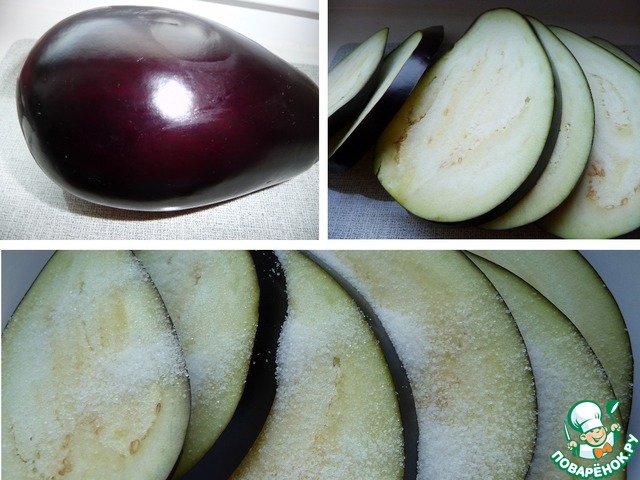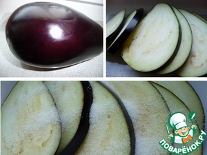Баклажан разрезать на 6-7 продольных ломтиков толщиной около 1 см, щедро посыпать солью, залить холодной водой, накрыть тарелкой, чтобы баклажан был в воде и оставить минут на 20.