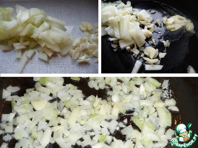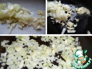 Лук и чеснок нарезать мелкими кубикамии. Поставить сковороду на средний огонь и на смеси растительного (1ст. л.) и сливочного масел обжарить, помешивая, до мягкости и полупрозрачности.