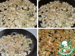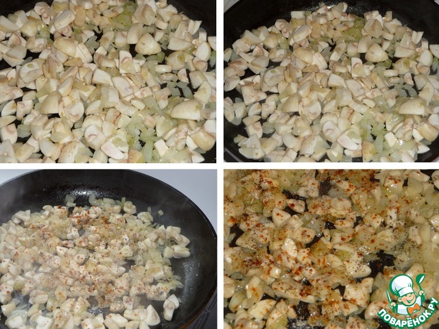 Шампиньоны нарезать мелкими кубиками (я не мыла, только почислила), добавить к луку с чесноком, увеличить огонь и жарить, пока вся влага не выпарится. Добавить соль, смесь перцев.