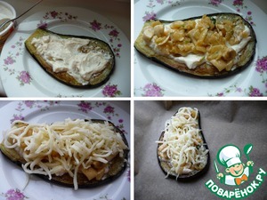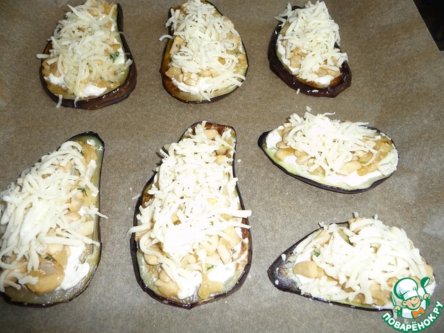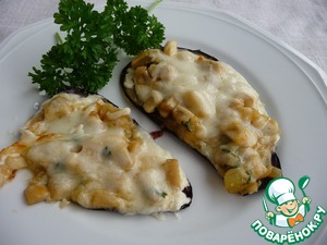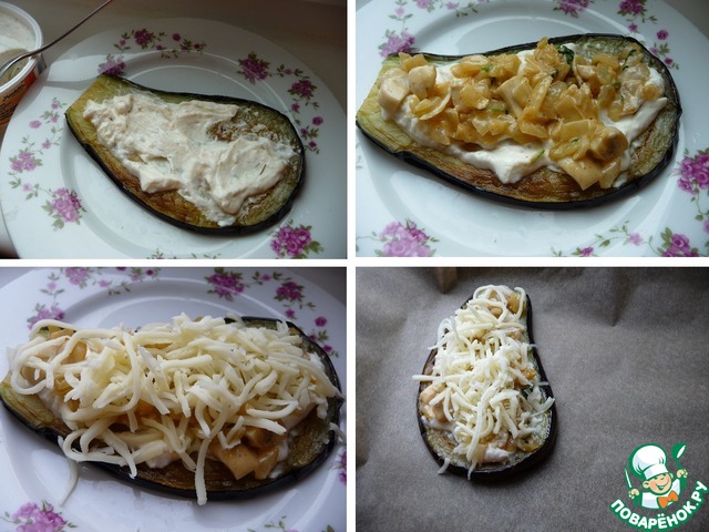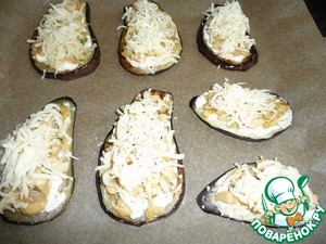 Приостывшие дольки баклажана каждую смазать сливочным сыром. Выложить подготовленные грибы и натертый сыр. Заготовки переложить на противень, застеленный пекарской бумагой.