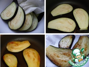 У баклажана слить воду, каждый кусочек обсушить бумажным полотенцем. Обжарить дольки баклажана с двух сторон в разогретом растительном масле до золотой корочки. Готовые баклажаны выложить на бумажное полотенце, чтобы убрать лишний жир.