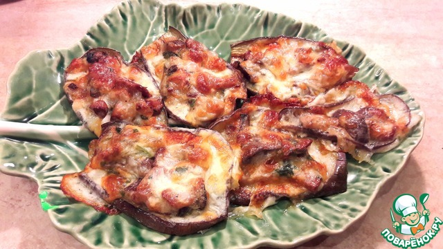 Пока сыр не расплавится. Кто любит сильно запеченый сыр, время увеличить. Аккуратно переложить баклажаны на тарелки, чтобы начинка не улетела с баклажана. Подавать закуску горячей.