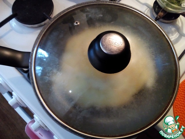 Накрываем крышкой и доделываем глазунью до готовности и конечно же блин. По желанию глазунью можно посолить. Я не делаю этого.